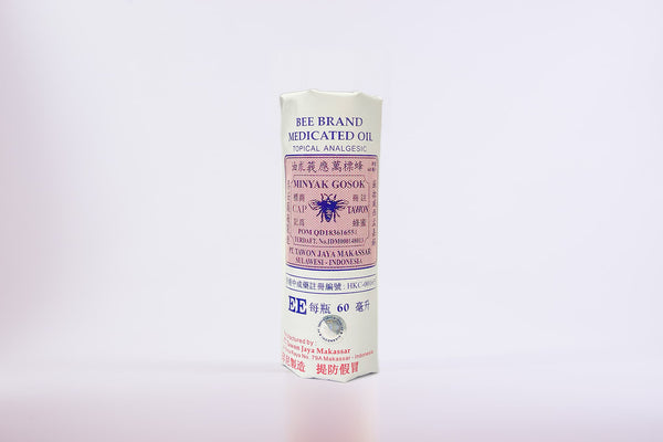 Bee Brand Medicated Oil is manufactured by Minyak Gosok from a combination of traditional herbs, including Oleum Cocos, Oleum Cajuputi, Oleum Citronellae, Oleum Terebinthinae, Caulis ef Folium Piperis Hance, Zingiberis Rhizoma, Curcumae Rhizoma, Allium Sativum, Kaemferia Pandurata Rhizoma, Bupleurum Falcatum Radix, Mentholum, Camphora, Asarum Sieboldi Herba . It can relieve simple backache, sprains, muscular & skeletal pain, burns and insect bites, colds and dizziness.